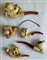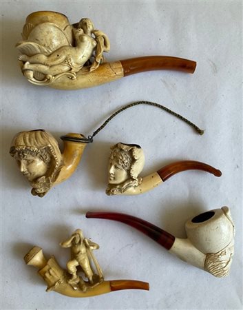 Lotto composto da cinque pipe in schiuma di mare intagliata e materiali differenti con soggetti diversi tra cui profili e figure. Secolo XIX - XX (difetti e mancanze)