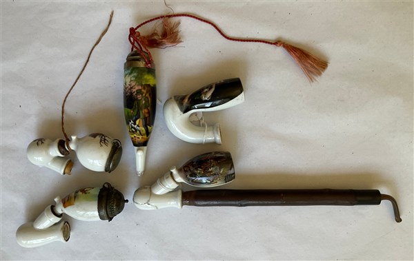 Manifattura tedesca del sec XIX. Lotto di cinque pipe in porcellana decorate a