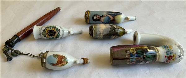 Lotto 2837 | Manifattura tedesca del sec XIX. Lotto di cinque pipe in porcellana decorate a