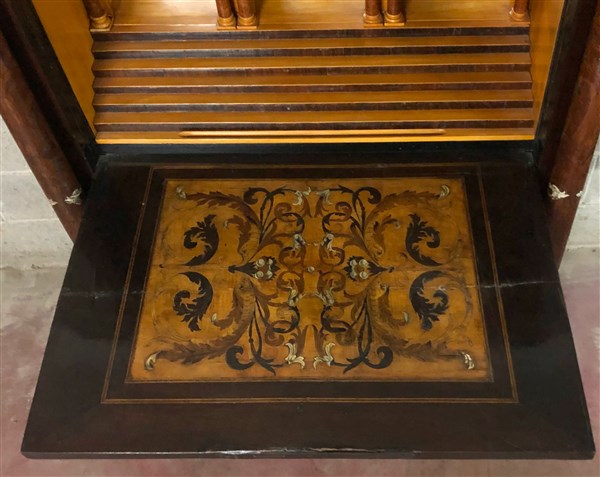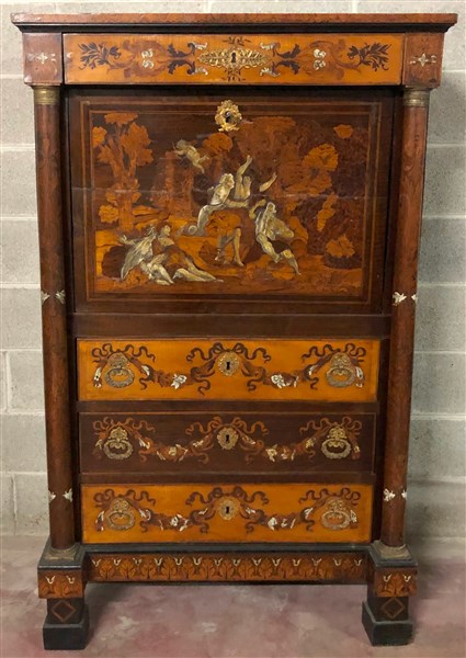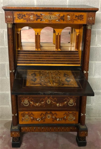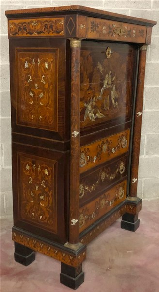 Secretaire interamente intarsiato in osso e legni vari a scena classica nell'an
