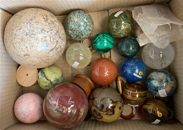 Cartone continente numerose sfere in marmo, quarzo e pietra dura (difetti)