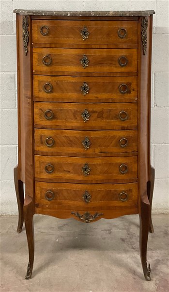 Settimanale di forma mossa in legno lastronato e filettato, piano in marmo e guarnizioni in bronzo (cm 74x117x39) (difetti)