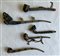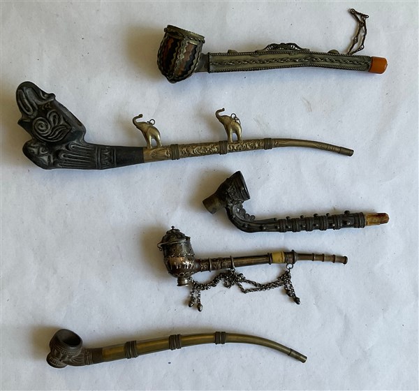 Lotto composto da cinque pipe con decoro mediorientale in materiali differenti e parti in metallo argentato (difetti e restauri)