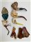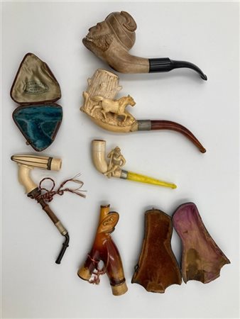 Lotto composto da cinque pipe in schiuma di mare intagliata e materiali differenti con soggetti diversi tra cui animali, profili e figure, secolo XIX. In custodie (difetti e rotture)
