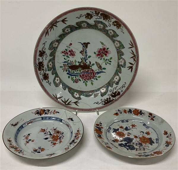 Compagnia delle Indie, lotto di tre piatti in porcellana con decori a motivi naturalistici. Cina, sec. XVIII/XIX (d cm 35 e 23) (gravi difetti e restauri)