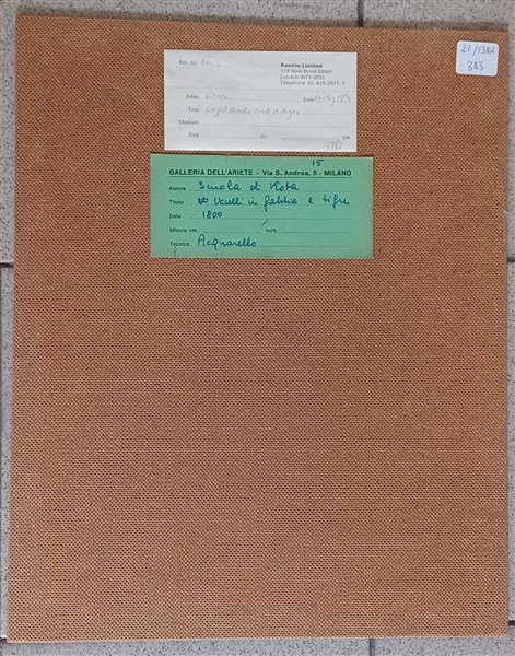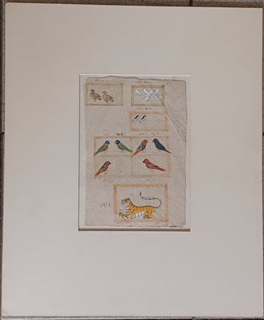 Scuola indiana, secolo XIX "Composizione con tigre e uccelli in gabbia" tecnica mista su carta (cm 10,5x16)