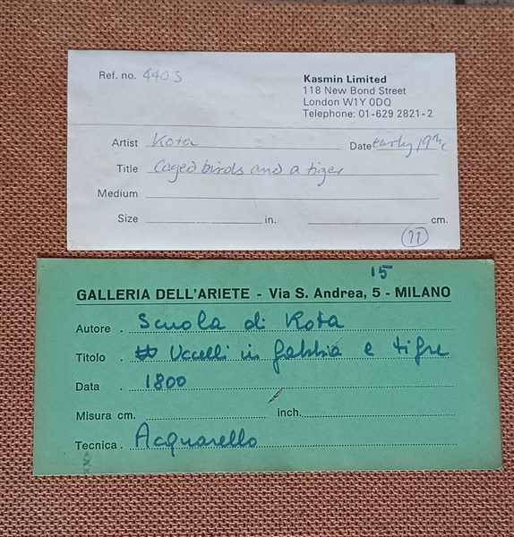 Scuola indiana, secolo XIX "Composizione con tigre e uccelli in gabbia" tecnica