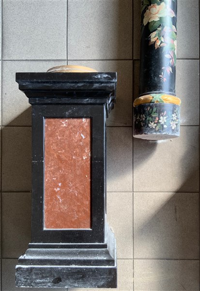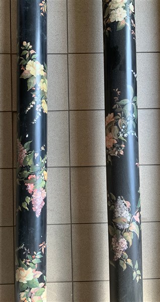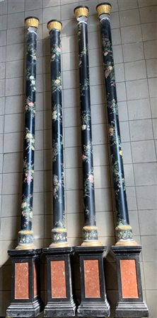 Lotto composto da quattro colonne in gesso decorate in policromia a fiori con capitelli dorati e basi a plinto in marmi rosso e nero (h. cm 265 ca.) (gravi difetti)