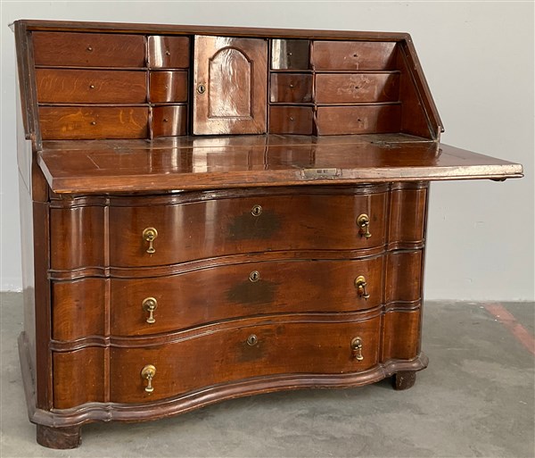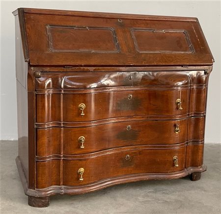 Ribalta con fronte mosso a tre cassetti e mezzo, celante scarabattolo con cassetti e vano. Secolo XIX (cm 114x103x60) (difetti)