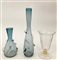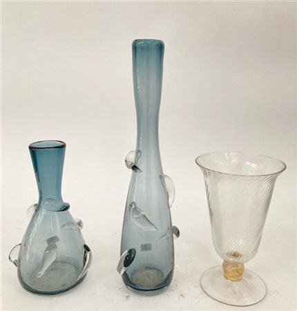 lotto composto da due vasi in vetro soffiato color fumé con applicazioni in rilievo ed un vaso in vetro trasparente incolore con inclusione di foglia d'oro. Anni '70/'80. (h max cm 50) (lievi difetti)