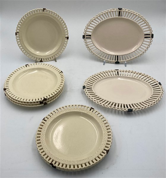 Manifattura secolo XIX gruppo di otto fra piatti e vassoi in ceramica a bordo traforato. Misure diverse (difetti)