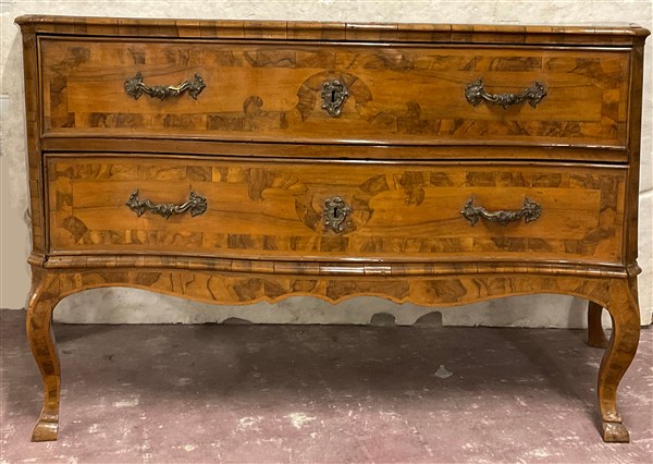 Cassettone di forma mossa sul fronte e sui fianchi in legno impiallacciato e radicato, a due cassetti. Gambe e grembiali sagomati , Emilia secolo XVIII (cm 167x92x65) (difetti e restaui)