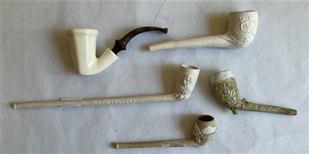 Lotto composto da cinque pipe in ceramica di manifatture e decori differenti (d
