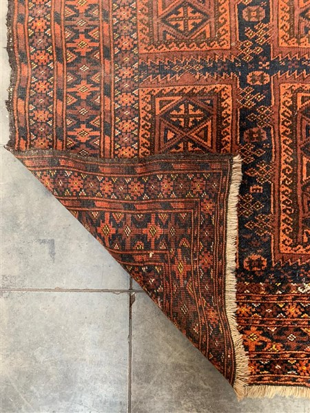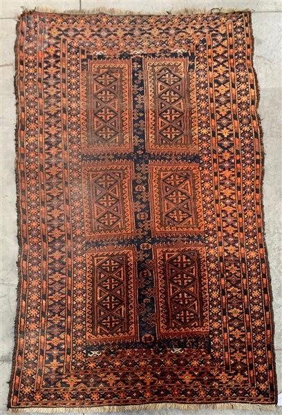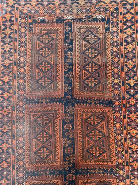Tappeto Afghan, Turkestan occidentale, secolo XX. Decoro con sei medaglioni rettangolari nei toni dell'arancio, marrone e marrone su fondo blu (cm 186x144) (difetti)