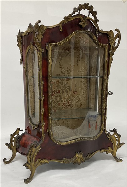 Vetrinetta da tavolo di forma mossa lastronata a finta tartaruga con guarnizioni in metallo, interno rivestito in tessuto con ripiani in vetro (cm 36x49x16) (difetti)