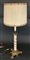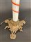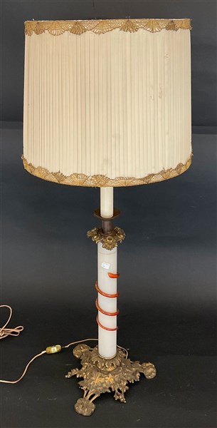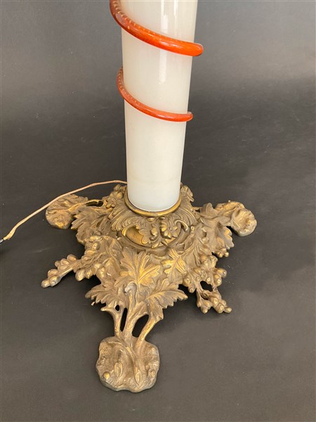Lampada con ghiere in bronzo decorate a fiori e volute e corpo in vetro bianco con serpente avviluppato, pasta vitrea arancione decorata a freddo con dorature. Inizio secolo XX