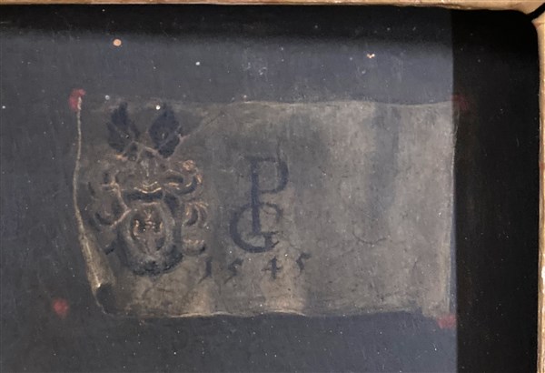 Ignoto, antico dipinto raffigurante "Martirio di San Sebastiano", olio su tavola (cm 58,5x43,5). In cornice