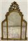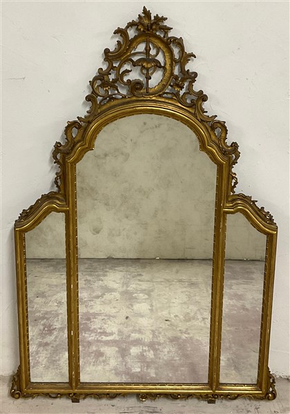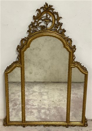 Specchiera tripartita in legno intagliato e dorato a volute e fiori (cm 144x100) (difetti)