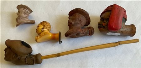 Lotto composto da cinque pipe in materiali differenti raffiguranti volti (difetti e mancanze)