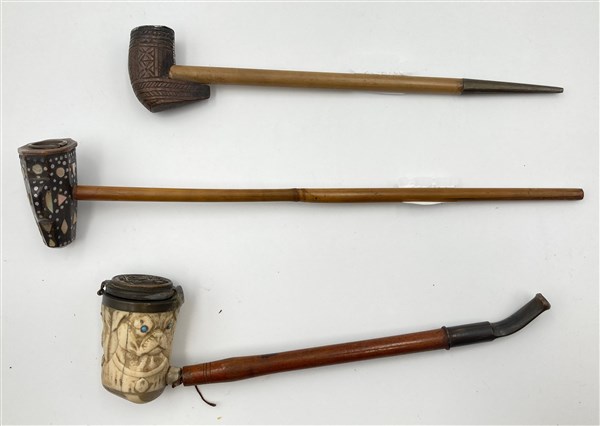 Lotto 2922 | Lotto composto da tre pipe di manifattura orientale in metallo, osso e madreper