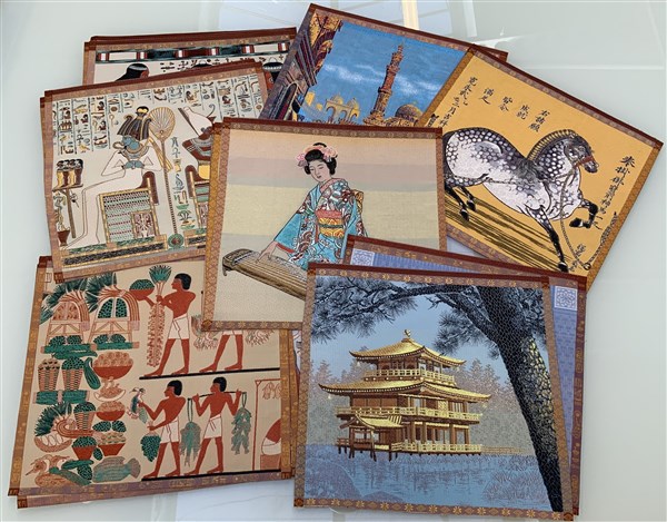 Lotto composto da quattro retouchè thailandesi su tessuti stampati (cm 31x23) e una cartella contenete numerosi tessuti a soggetto egiziano e cinese (cm 28x30 circa) (difetti)