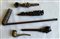 Lotto composto da cinque pipe di materiali e decori differenti tra cui una in bronzo a forma di pistola e due in legno intagliato con decori stilizzati (difetti)