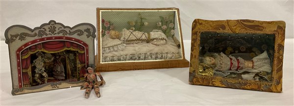 Lotto composto da due teche contenenti figure in cera e una con carillon e burattini