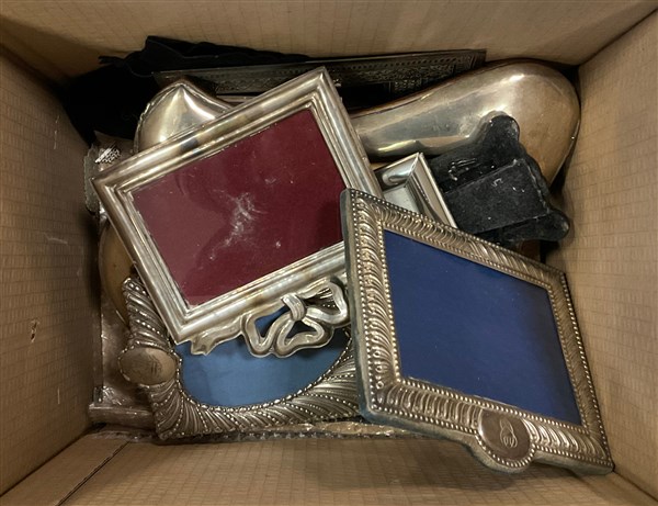 Cartone contenente numerose cornici portafoto, alcune in argento