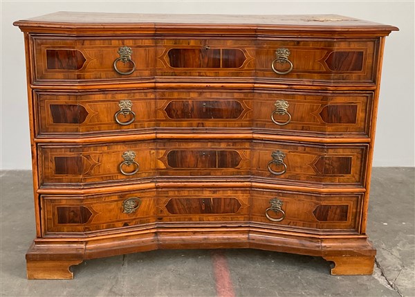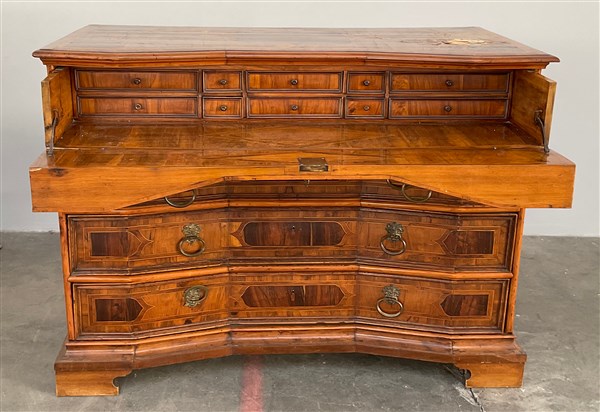 Canterano lastronato e filettato in legni diversi, fronte a tre cassetti con finto cassetto con scarabattolo sottopiano, piedi a mensola, secolo XVIII (cm 144x105x68) (difetti e restauri)