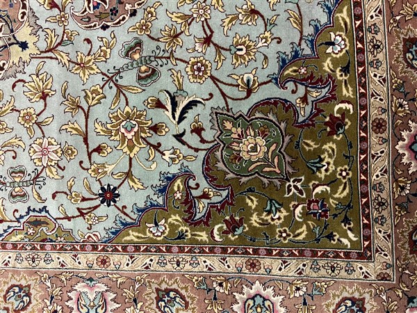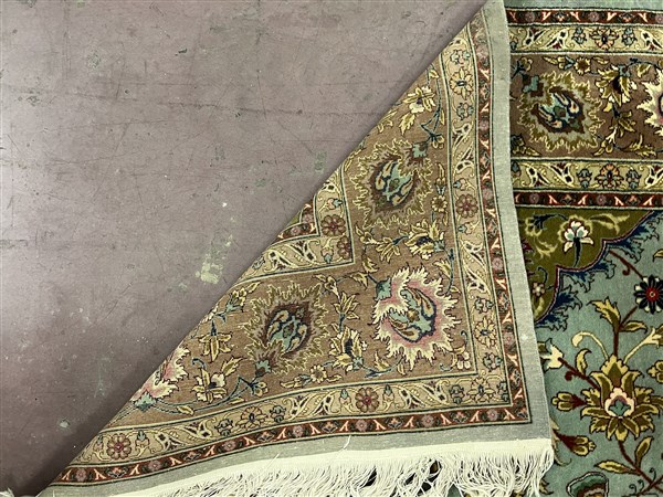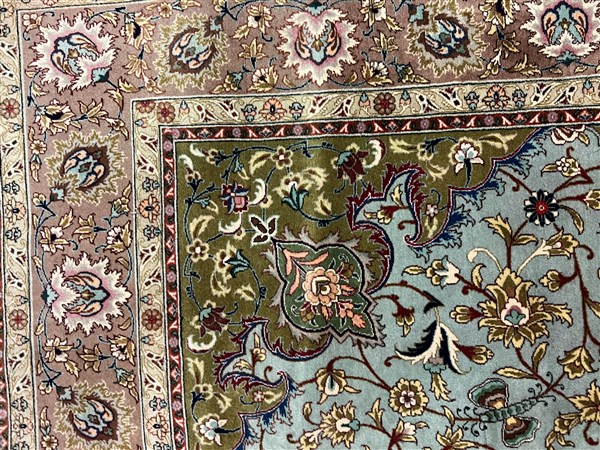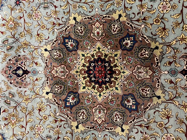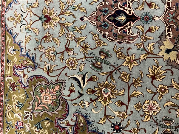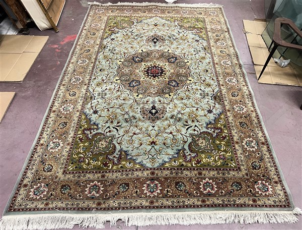 Tappeto Tabriz, Persia, secolo XX. Annodato in lana e seta, decoro con medaglione tondeggiante con puntali a fondo camoscio. Campo color azzurro chiaro cosparso di volute e rami fioriti. Elegante bordura Herati su fondo camoscio (cm 309x203) (lievi difetti)