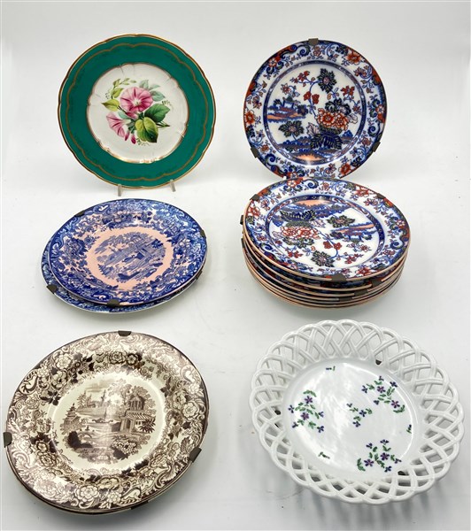 Lotto composto da quindici piatti in ceramica e porcellana di diverso decoro (difetti)