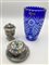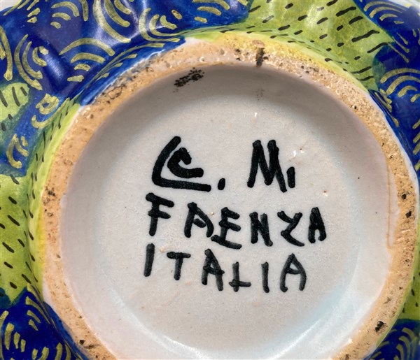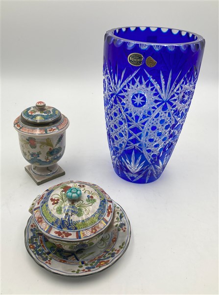 Lotto composto da un vaso in cristallo, un vasetto e una tazza da puerpera di manifattura faentina (difetti)