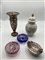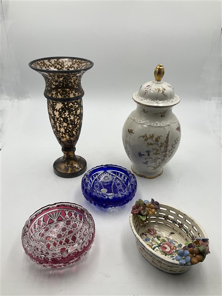 Lotto composto da due posaceneri in cristallo, un vaso in vetro intarsiato in argento, un potiche in porcellana e un cestino della manifattura di Nove (lievi difetti)