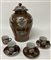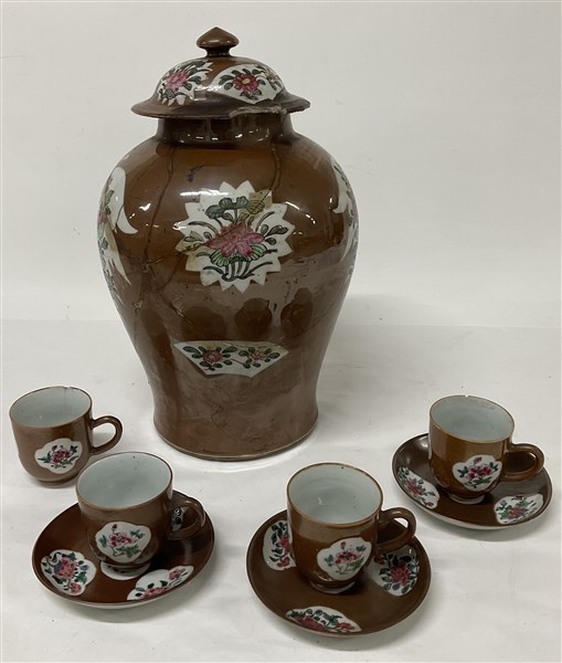 Parte di servizio in porcellana "café au lait" con decoro a fiori entro riserve composto da quattro tazzine con tre piattini unito ad una potiche di decoro analogo. Cina, secolo XVIII/XIX (gravi difetti, mancanze e restauri)