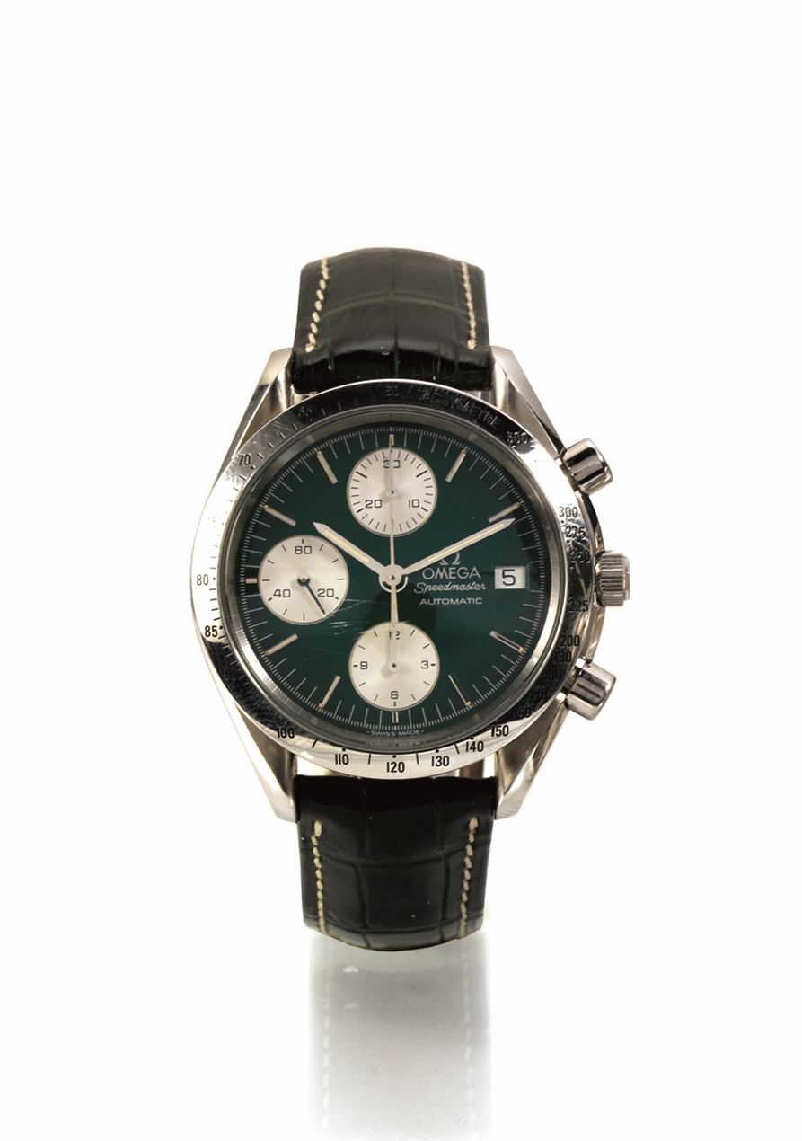 Cassa in tre corpi con fondello a vite con logo Speedmaster, pulsanti cronografici circolari, vetro zaffiro, lunetta graduata con scala tachimetrica. Quadrante verde con tre contatori ausiliari argentè ad ore 6, 9 e 12 rispettivamente con registro delle 12 h, secondi continui, registro dei 30 minuti, datario a ore 3, indici applicati a bastone, lancette con inserto in materiale luminescente, secondi cronografici al centro.Movimento a carica automatica. Cinturino in pelle con fibbia ad ardiglione