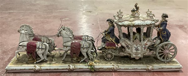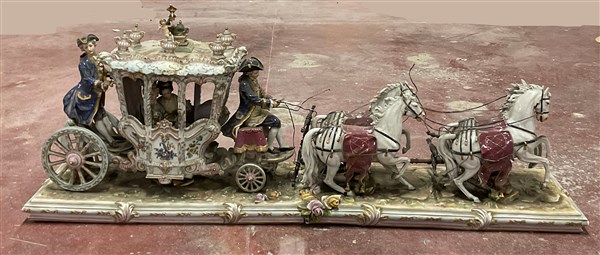 Grande gruppo in porcellana policroma composto da due elementi raffigurante una carrozza con gentildonne cavalli e conducenti. Marcato von la "N" coronata su un elemento (cm 91x35x21) (lievi difetti)