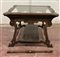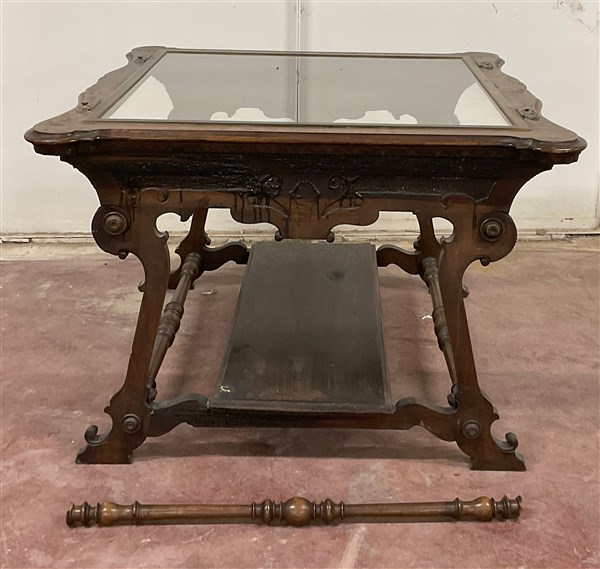 Tavolo con piano in vetro. Gambe mosse riunite da pianetto e traverse tornite ( cm 68x97)