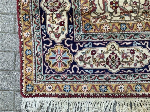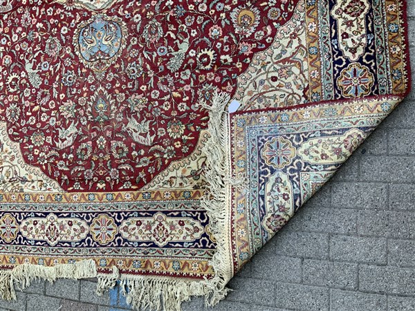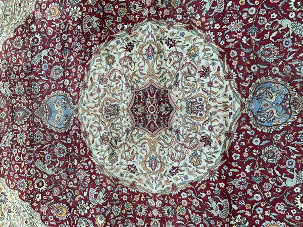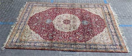 Tappeto Keshan, Persia, secolo XX. Decoro floreale su fondo bordeaux con medaglione e riserve a fondo bianco decorate con animali (cm 378x272) (difetti)