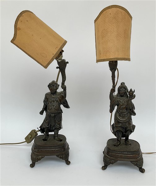 "Dignitari" coppia di figure in bronzo reggitorcia montate a luce elettrica Ma