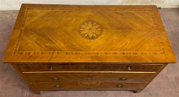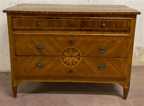 Cassettone lastronato, intarsiato e filettato in legni vari. Fronte, fianchi e piano riquadrati da cornice e centrati da medaglioni con fiore. Fronte a due cassetti sotto uno a mezza altezza. Gambe rastremate . Secolo XVIII (cm 120x90x57) (difetti e restauri)