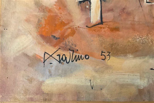 Firma indecifrata, "Paesaggio con case", 1953. Tecnica mista su carta applicata