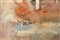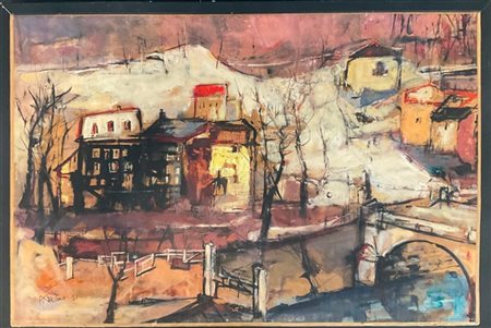 Firma indecifrata, "Paesaggio con case", 1953. Tecnica mista su carta applicata su tela (cm 40x60) Firmato e datato in basso a sinistra