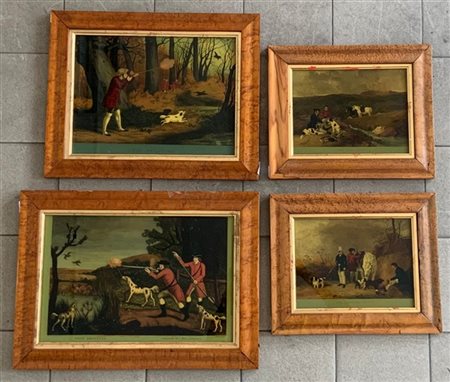 Gruppo di quattro incisioni inglesi a colori raffiguranti scene di caccia. In c