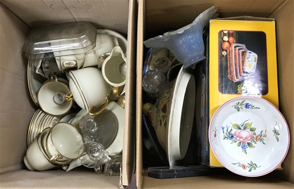 Lotto di due cartoni contenenti numerosi oggetti, principalmente per la tavola, in ceramica ed altri materiali (difetti)
