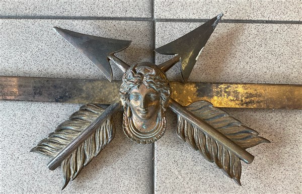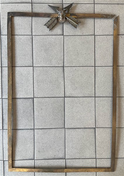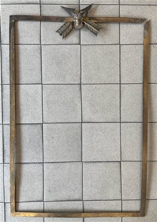 Cornice in metallo argentato decorato con mascherone raffigurante volto con frecce intrecciate. Francia, inizio secolo XX (cm 100x68) (difetti e mancanze)
