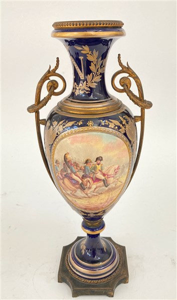 Manifattura francese. Vaso biansato in porcellana montata in bronzo decorata su fondo blu a scene napoleoniche e paesaggi in policromia e volute dorate (h. cm 40) (lievi difetti)