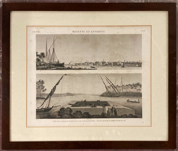 Lotto composto da una incisione del secolo XIX raffigurante scorci del Nilo e due riproduzioni, misure differenti in cornici (difetti)