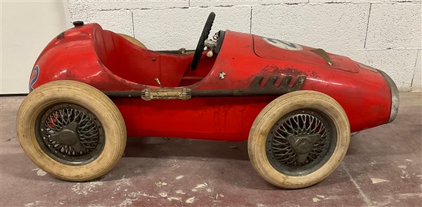 Automobilina a pedali con scocca in materiale plastico e ruote con gomme, unita a un'automobilina a spinta elettrica (difetti e mancanze)