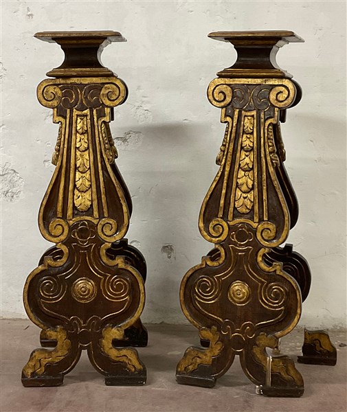 Coppia di antichi portavasi di forma mossa in legno dipinto e dorato a volute (h cm 113) (difetti e rotture)
