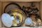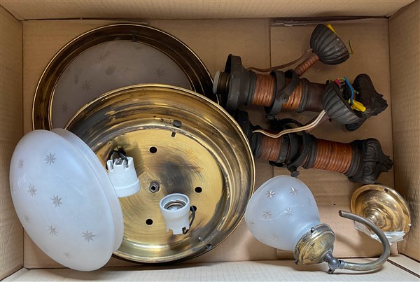 Cartone contenente due plafoniere, una applique con vetri decorati a stelle e due applique in metallo di diversa fattura (difetti)